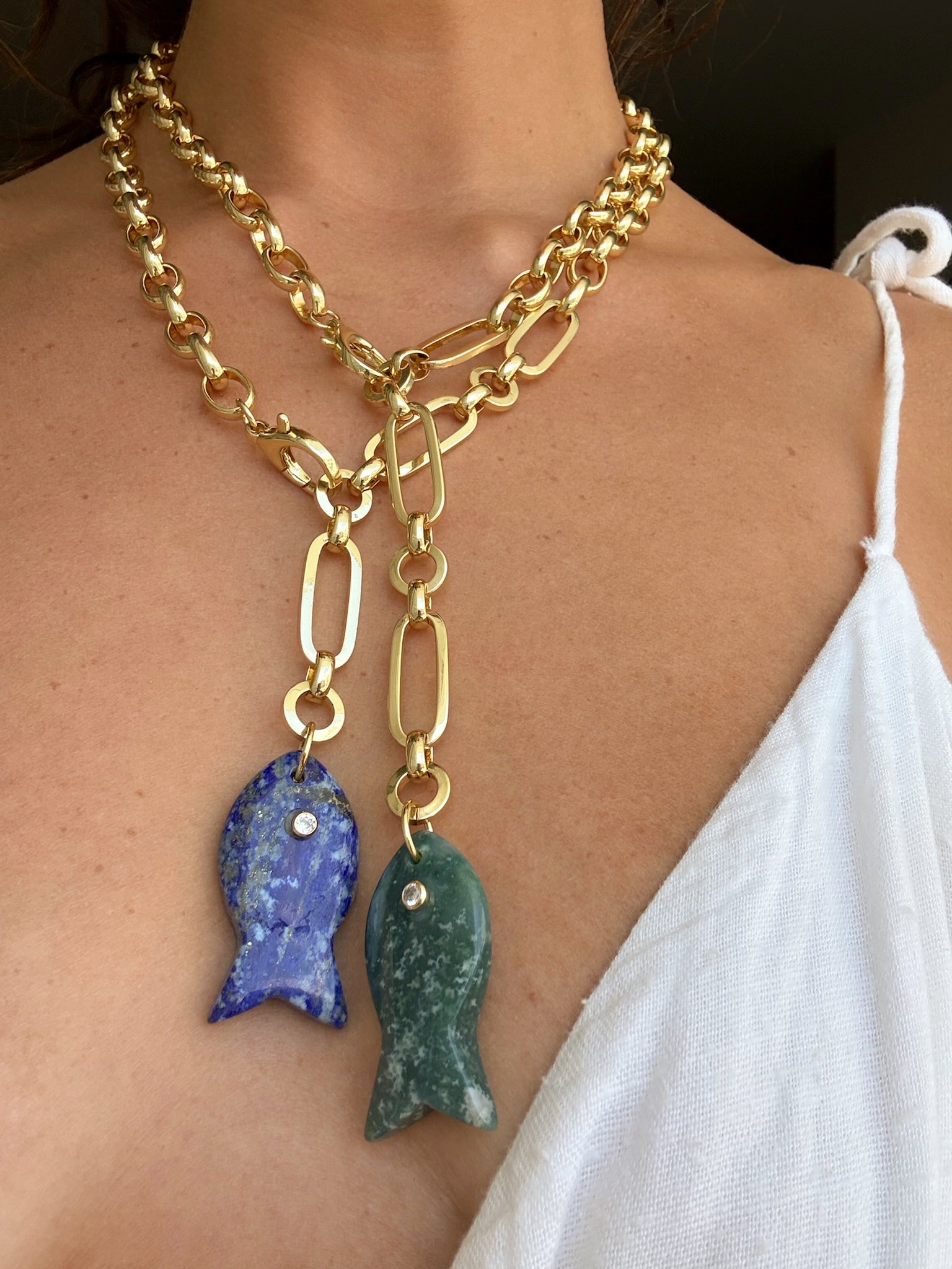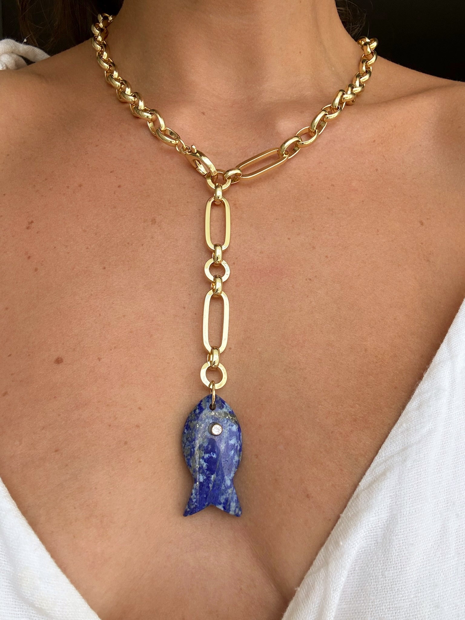 A versatile lariat-style gold necklace featuring oval rolo links and mixed chain textures. The adjustable front clasp leads to a gemstone fish charm that adds a polished, coastal-inspired accent.